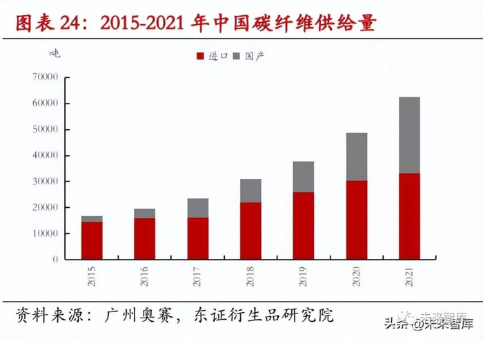 国内碳纤维起步晚,进口依存度较高。国外碳纤维厂商如日本东丽在 2000 年初即实现了 T300-T700 产品工艺和产业的突破, 成为先行者,垄断全球市场;而中国厂商的产业化在 2010 年起步,2015 年兴起,国内 碳纤维进口依存度仍然较高,2021 年碳纤维行业整体进口量为 3.3 万吨,较 2020 年上 涨 8.72%,占总需求的 53.1%。一方面随着国内市场需求的提升,碳纤维进口量和国产供应量都在同步提升。另一方 面,随着国内企业产能的提升,进口依存度也在逐年下降,进口比率从 2015 年的 85.2%降低到 53.1%,进口依赖度高,本质上还是生产技术上和海外龙头还存在较大差 距。由于 2020 年日本东丽向我国禁售碳纤维造成供给短缺,国产替代的重要性愈发凸 显,未来三年,随着工艺的改进及产能的提升,国产替代有望加快节奏。