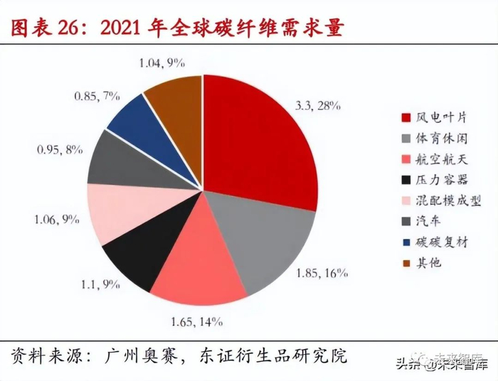 碳纤维材料在下游有着广泛的应用,2021 年我国碳纤维总需求 6.24 万吨,需求量最大 的领域是风电叶片,体育休闲和碳碳复材,约占总需求 80%左右。根据广州奥赛的数 据,2021 年我国风电叶片碳纤维(大丝束)需求量在 3.3 万吨,预计 2025 年需求将达 到 8.05 万吨,CAGR 为 20%。国内方面应用于工业的大丝束供应主要以吉林化纤、吉 林碳谷为主,目前产能约为 2.2 万吨,难以满足下游需求。