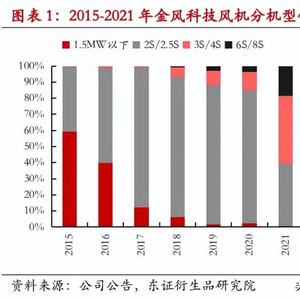 随着近几年风电补贴退去,风电产业链承受着巨大的降本压力。风机大型化的趋势也 在降本增效的进程中越发凸显,一方面,风机大型化能够减少单位 GW 零部件的用量, 减少土地使用,施工安装等成本,另一方面,更大的风机叶片捕捉风能资源的能力更 强,可以提升有效发电小时数。我们从国内风电主机龙头金风科技的机型销售占比就 可以看出,1.5MW 以下的机型逐渐被淘汰,而 3MW 以上的机型占比不断提高,2021 年 占比达到 61%。CWEA 的数据显示,陆上风机和海上风机的平均单机容量已经达到 3.1MW 和 5.6MW。预计未来 2-3 年新增装机的主流机型,陆上风机将会达到 4-6MW, 而海上风机则会达到 8MW 以上。