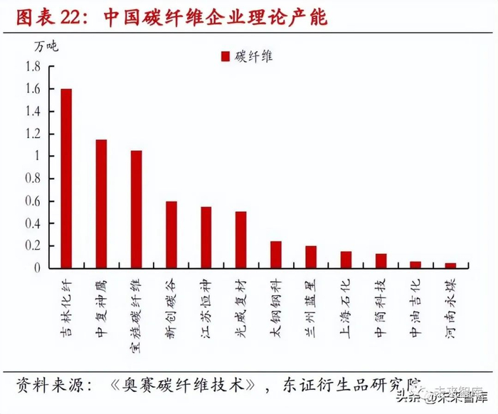 国内大丝束原丝龙头吉林碳谷。大丝束原丝产品价格相对小丝束较低,但生产控制难度大,可广泛用于工业与民用领 域,被称为“工业级材料”,被广泛应用于下游风电,建筑,汽车等工业领域。目前国内 企业的原丝产能大多仅用于满足自身碳纤维生产需求,国内市场上只有吉林碳谷一家 公司具备大规模外供能力,2021 年国产碳纤维原丝消耗量 6.14 万吨,其中吉林碳谷供 应了 3.26 万吨,占据了国内一半以上市场份额。1)在溶剂回收方面,吉林碳谷集团旗下的奇峰化纤拥有 20 年以上的腈纶生产经验,腈 纶的产线和碳纤维较为相似,奇峰的溶剂回收体系可以提升原丝溶剂回收效率,从而 降低生产成本。回顾海外碳纤维龙头土耳其阿克萨,美国卓尔泰克的发展历程,都具 有腈纶生产的经验,溶剂回收体系的技术积累,为吉林碳谷构筑了成本壁垒。
