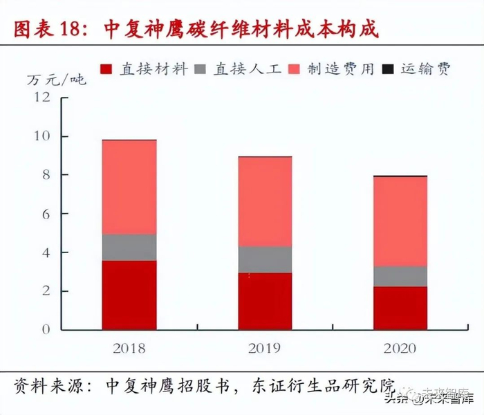 碳纤维在 19 年底至 21 年底价格迎来一波上涨,从 95 元/千克涨至 153 元/千克,这一阶 段碳纤维价格上涨的主要原因有以下两点:一是美国禁止日本东丽的高端碳纤维产品 卖到中国,造成一部分供给短缺;二是中国光伏和风电行业的碳纤维需求大幅增长, 造成供不应求的局面;2022 年开始,随着海上风电抢装潮退去,加上各大国内企业新 建产能陆续投产,2 月份开始 48K 碳纤维价格率先回落,4 月份 24K 碳纤维也打开降价 空间。截至 2022 年 11 月,48K 和 24K 碳纤维已经从价格最高点分别下降 11.8%和 14.6%。碳纤维的成本构成。以中复神鹰的碳纤维成本构成为例,2020 年中复神鹰碳纤维的直接成本在 7.97 万元/吨, 其中制造费用 4.58 万元/吨占比最高,达到总成本 58%,制造费用包括燃料费用 2.81 万 /吨。原材料成本 2.24 万元/吨,占比 28%。