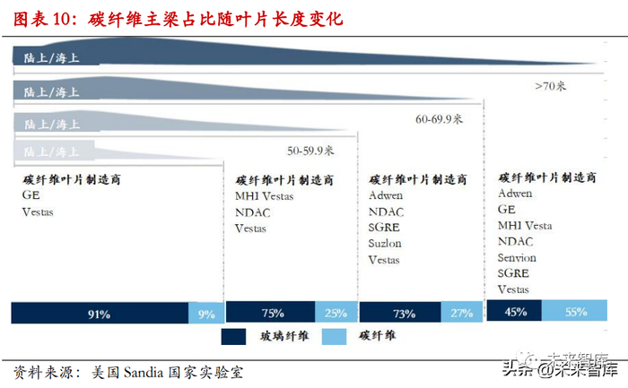 在全玻纤情况下,随着叶片长度增加,自重载荷占比线性上升,可用于发电的载荷相 应下降。因此在大功率风机应用场景中,碳纤维替代具备的了必要性。根据 Sandia 实 验室的数据,随着叶片长度变长,碳纤维的渗透率也逐渐提升。49.9 米以下长度的渗 透率仅为 9%,而 70 米以上的叶片渗透率达到了 55%,对于 10MW 以上的大型风机, 碳纤维渗透率更是达到 100%。可以预期未来以大兆瓦机型为主的海上风电,碳纤维替 代将会更加具有必要性。