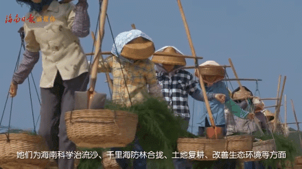 行走在沙滩上的植树娘子军