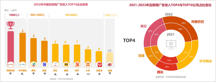 从企业看,2022中国互联网广告收入TOP10企业分别为阿里巴巴、字节跳动、腾讯、百度、京东、美团、快手、小米、拼多多和微博。在行业前十的头部企业中,BAT广告收入均出现较大幅度的下滑,三家合计下降355亿元,各家降幅均超过9%。行业前十的企业广告收入规模合计下降247亿元,降幅为4.79%,小于市场整体降幅。