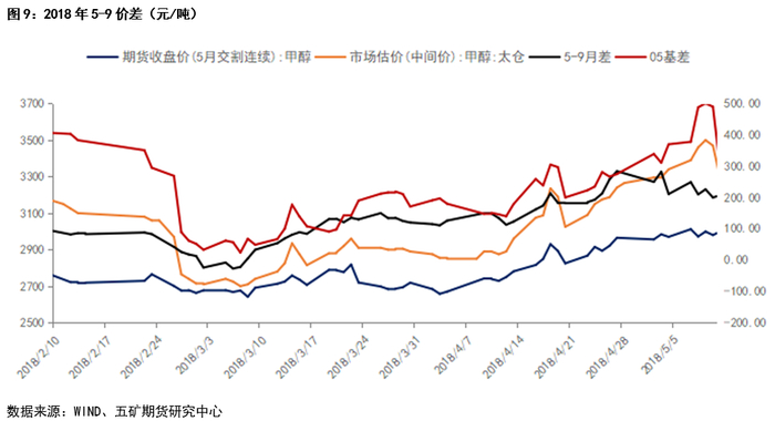 原因:在每年6月初-9月初甲醇主要以累库为主,这段时间甲醇春季检修基本结束,上游开工基本恢复,供应增加,叠加梅雨季节(6-8月)影响甲醇传统下游的开工,因此供增需减导致甲醇库存走高,内地传统下游5-8月是传统降负期,且内地春检5月结束后供应亦重新回升。另外01合约供应端有冬季限产的预期在,盘面一般会给到一定的溢价,从而使得即便09合约的基本面较好,9-1价差也难以出现大幅走高。
