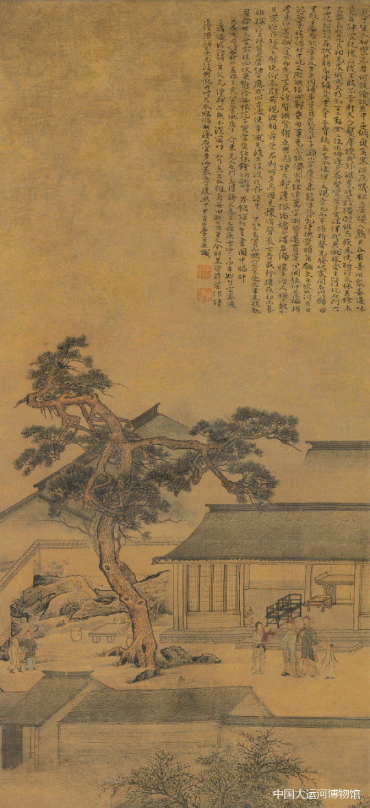 此图一院落,内有数人。画面上方长题画家自作诗。由题款可知诗画均为怀念三十四年前寄居友人家中之场景。图中院落精细却不死板,人物情态丰富、自然,生活气息浓厚,是画家真情实感的流露。