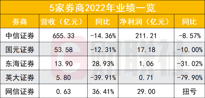 1月12日,包括上市券商中信证券和国元证券、新三板挂牌券商东海证券、国网英大旗下英大证券、指南针旗下网信证券同日披露2022年业绩。2022年,中信证券归母净利润为211.21亿元,同比下降8.57%;国元证券归母净利润为17.18亿元,同比下降10%;东海证券净利润为1.06亿元,同比下降31.02%;英大证券净利润为0.71亿元,同比下降79.9%;网信证券净利润为29亿元,同比扭亏。