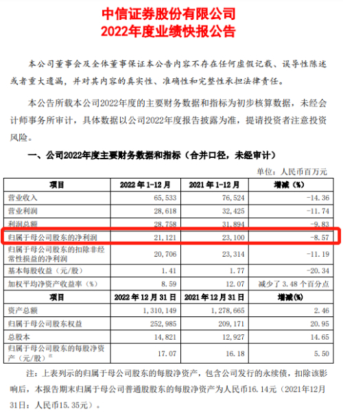 中信证券业绩仅小幅下滑,业绩快报显示,2022年,公司实现营业收入655.33亿元,同比下降14.36%;实现归属于母公司股东的净利润211.21亿元,同比下降8.57%。