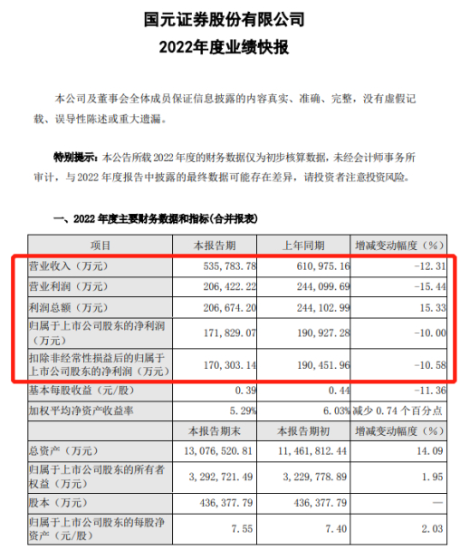 国元证券同日发布的业绩快报显示,2022年,公司实现营业收入53.58亿元,同比下降12.31%;归属于上市公司股东的净利润17.18亿元,同比下降10%。公司加权平均净资产收益率为5.29%,同比减少0.74个百分点。
