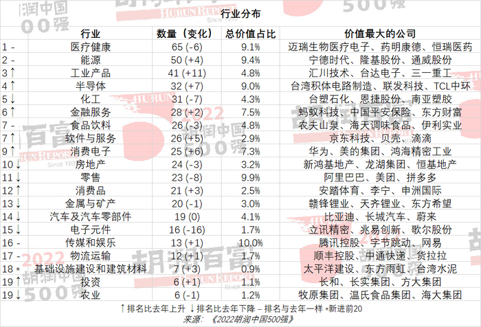 ❖ 以汇川技术为首的工业产品行业今年快速上升,成为500强企业数量第三多的行业,医疗健康和能源行业仍是前两名。增长较多的还有半导体和消费电子行业,下降较多的则是电子元件、零售和化工行业