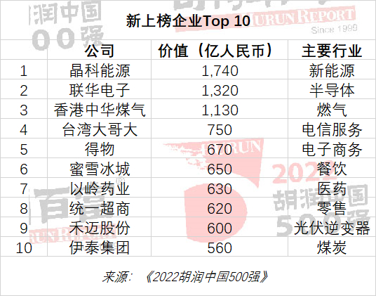 ❖ 99家(20%)企业新上榜,其中3家企业价值上千亿,分别是江西光伏企业晶科能源、台湾半导体公司联华电子和香港中华煤气。新上榜企业还包括潮流网购平台得物、蜜雪冰城、以岭药业等