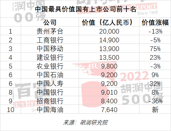 中国大约有230家国有上市公司能达到今年“胡润中国500强”的上榜门槛(280亿元),但因为“胡润中国500强”只包含非国有企业,因此这些企业都不在榜单上。如果算上国有非上市公司,应该还将包括中华香烟、国家电网、CCTV等。
