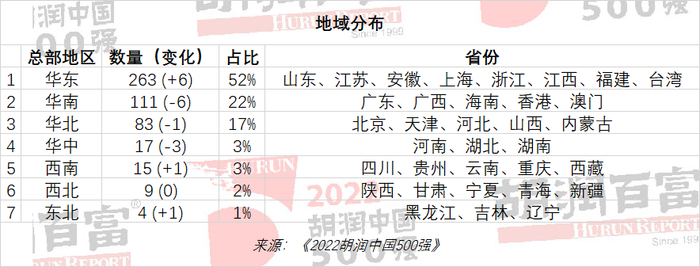 华东地区共263家企业进入500强,占全国52%;华南地区占全国22%。