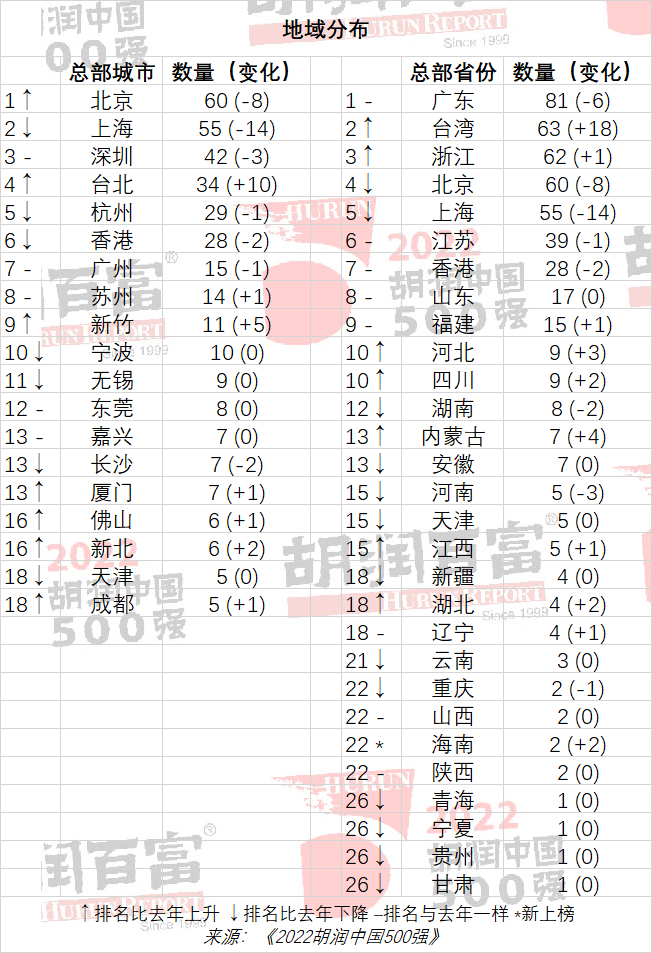从省份来看,广东以81家保持第一,台湾以63家升至第二。浙江进入前三,有62家。广西、黑龙江、吉林、西藏和澳门没有企业上榜。