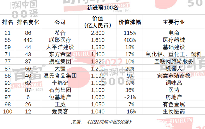 ❖ 12家企业新进前100名,以跨境电商平台希音为首,其价值翻了一番,达到2,800亿元,上升86位,排名第21;其次是医学影像设备企业联影医疗,其价值增长四倍至1,610亿元,上升442位,排名第55