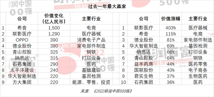 从价值上涨的数额来看,过去一年增长最多的是希音、联影医疗和OPPO。从价值上涨的比例来看,涨幅最大的是联影医疗和希音。
