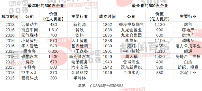 《2022胡润中国500强》上榜门槛比上一年下降40亿元,即13%,至280亿元。500强企业总价值比上一年下降15万亿,即23%,至51万亿元。平均价值比上一年下降280亿元,至1,020亿元。182家上榜企业的价值比上一年有所增长,包括99家新上榜企业;8家企业的价值和上一年一样;312家企业的价值有所下降。57%是B2B企业,43%直接面向消费者。76%提供实体产品,24%提供软件或服务。500强企业平均年龄27岁,相当于平均成立于1995年。