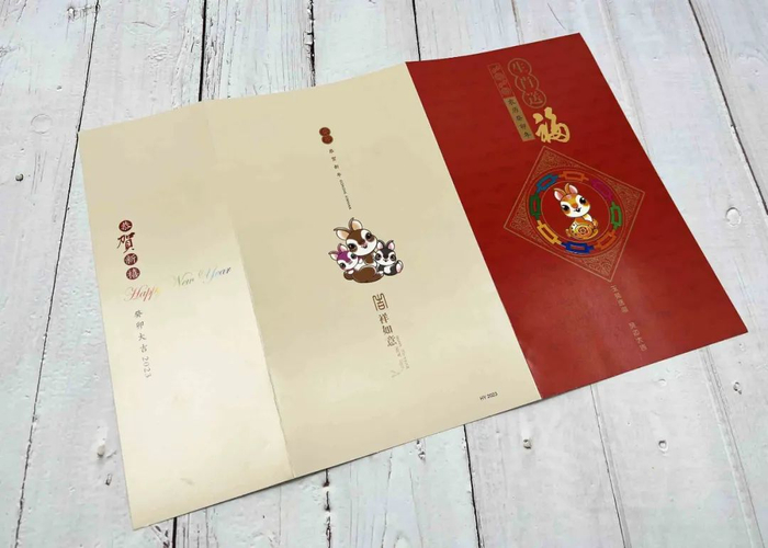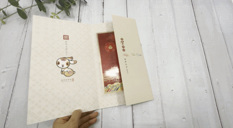 赠送的贺卡采用红金配色,并衬以传统吉祥纹样,中式风格浓郁,喜庆而典雅。