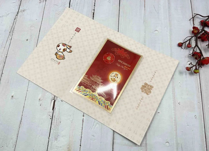 邮票金搭配上邮票珍藏邮折,内含特殊工艺《癸卯年》特种邮票版式二和产品证书,是整体风格大气的不二佳品!
