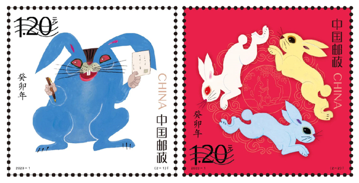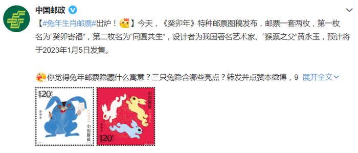 最近一条消息冲进了热搜榜:中国邮政发布2023年兔年生肖邮票啦!