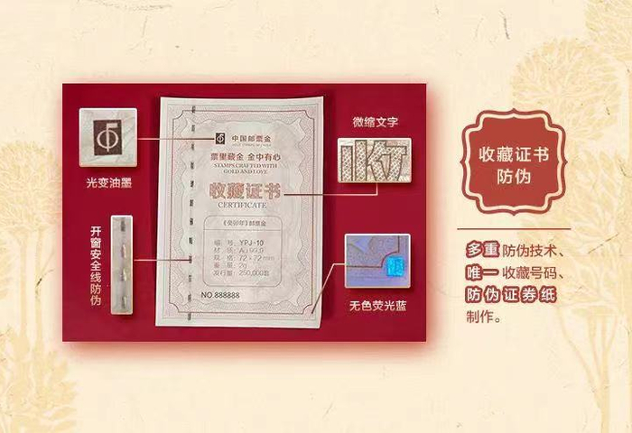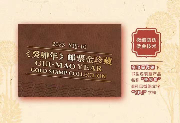 不单单如此,《癸卯年》邮票金拥有金制品微缩文字防伪、收藏证书防伪、邮票纸防伪、微缩防伪烫金技术等多重防伪。