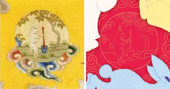 由三只作奔跑状的兔子环绕而成,背景则是以“玉兔捣药”纹饰图案设计为主,表达了疫情之下祈求平安健康的真挚愿望。