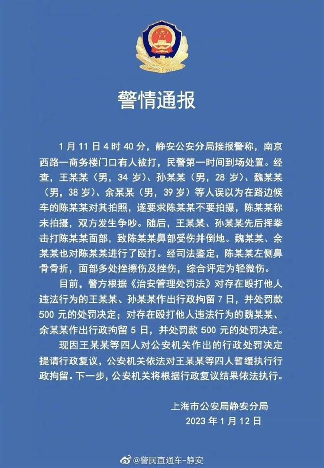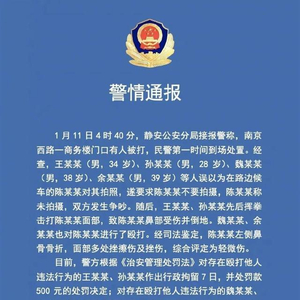 通报显示,1月11日4时40分,王某某(男,34岁)、孙某某(男,28岁)、魏某某(男,38岁)、余某某(男,39岁)等人误以为在路边候车的陈某某对其拍照,遂要求陈某某不要拍摄,陈某某称未拍摄,双方发生争吵。王某某、孙某某、魏某某、余某某对陈某某进行殴打。
