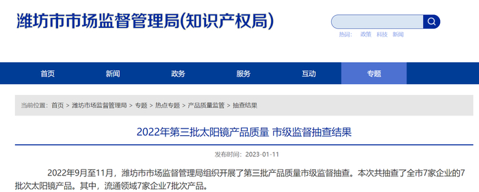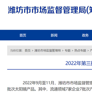 中国质量新闻网讯 2023年1月11日,山东省潍坊市市场监督管理局网站发布2022年第三批太阳镜产品质量市级监督抽查结果。