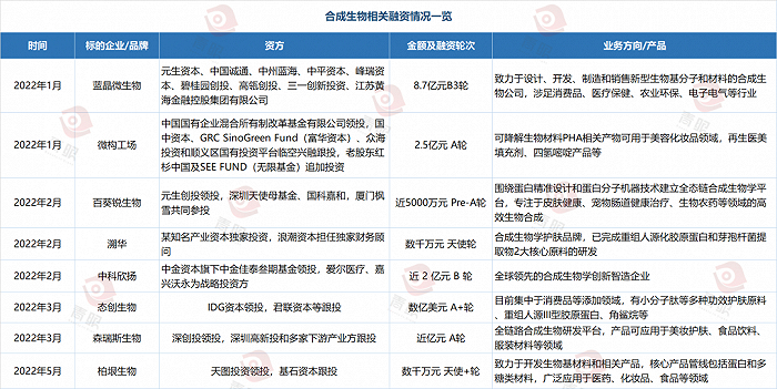 据了解,目前比较成熟的合成生物应用包括L-丙氨酸等化工产品、人造肉、护肤品原料角鲨烷,及部分药物中间体等。基于此,在募资不顺、投资放缓的2022年,合成生物独得资本青睐,站上投融资风口。