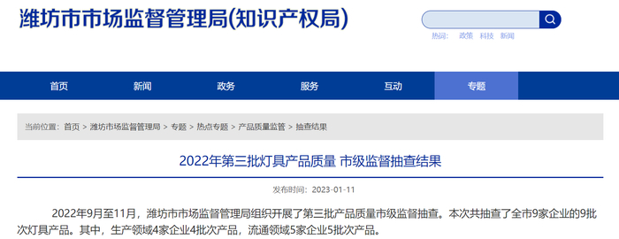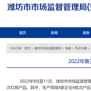 中国质量新闻网讯 2023年1月11日,山东省潍坊市市场监督管理局网站发布2022年第三批灯具产品质量市级监督抽查结果。
