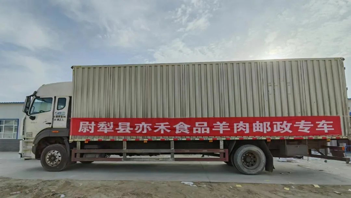1月8日,尉犁县邮政分公司行政人员在亦禾食品有限公司牛羊肉冷库厂房内协助打包。来源:新疆邮政微发布