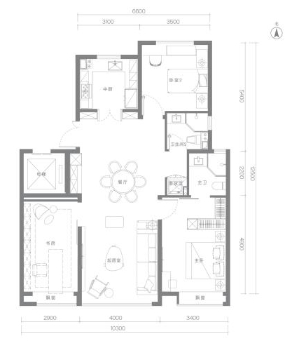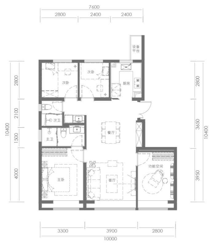 117m²四室两厅两卫,户型方正,通透格局。主卧、次卧、客厅南向三开间,采光通风俱佳。主卧套房设计,尽享专属私密空间。北向双空间,灵动可变,满足家庭成长空间需求。