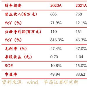 股权激励提供业绩指引,三年净利润CAGR达44%。公司2021年3月发布股票股权激励计划,同年5月31日完成了本次激励计划,共授予登记工作拟授予公司董事、高级管理人员和其他核心人员146人合计541万份期权。本计划授予的股票期权等待期分别为自授予登记完成之日起12个月、24个月、36个月,三个行权期内行权比例分别为40%、30%、30%,行权价格为28.25元。该计划的公司层面考核要求为,以2020年净利润1.1亿元为基数,2021-2023年净利润增长率分别不低于50%、100%、200%,即2021-2023年净利润分别为1.65亿元、2.2亿元、3.3亿元,年复合增长率达44%。