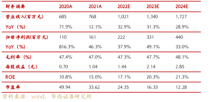 基于上述假设,预计公司2022-2024年实现营业收入10.21亿元、13.40亿元、17.27亿元,归母净利润2.22亿元、3.31亿元、4.40亿元,EPS分别为1.44元、2.14元、2.85元,对应2023年1月11日34.96元/股收盘价,PE分别为24倍、16倍、12倍。首次覆盖,给予买入评级。