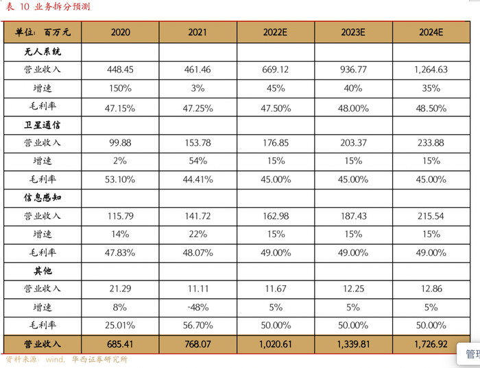 收入方面:受益于下游对演习训练产品的旺盛需求,公司产能有望进一步扩张,预计2022-2024年无人系统收入增速分别为45%、40%、35%;卫星通信收入增速分别为15%、15%、15%;信息感知收入增速分别为15%、15%、15%;其他收入增速分别为5%、5%、5%。