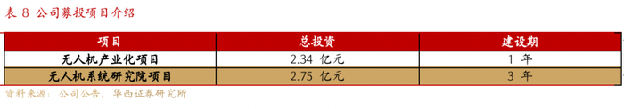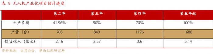 产业化项目满足临时性采购增多情况,预计第二年投产,第五年达产后新增年收入5.14亿元。随着部队训练模式的转变,无人机临时性采购和应急化采购不断增多,该等采购模式下,无人机企业需具备快速生产能力方能满足部队需求。通过开展无人机产业化基地建设,公司无人机生产效率将得到提升,对部队临时性采购和应急化采购订单的承接能力不断增强,无人机产业化项目预计开工后第2年建成并开始生产运行,在第5年达产,达产后预计新增年收入5.14亿元。