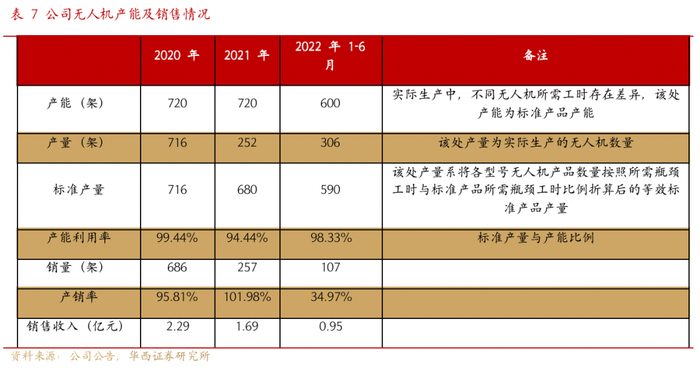 无人机产能利用率保持90%以上,产销率95%以上。公司于2020年开始实现无人机批量销售,2020年至2022年1-6月无人机产能利用率及产销率均保持高水平。产能利用率均保持90%以上,20年和21年产销率均在95%以上。21年产量和销售收入下降主要系下游客户招投标时点滞后、公司订单交付延迟所致。22年上半年产销率较低主要系公司当期针对新增无人机重大合同提前备货,且部分产品已交付客户,但由于尚未完成验收,未能确认销售收入所致。