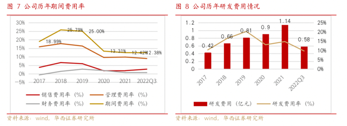 期间费用率呈下降趋势,研发费用稳步增长。公司期间费用率总体呈下降趋势,其中占比最高的管理费用率从2017年15.85%大幅降至2021年的9.84%,销售费用率从2018年最高的6.61%显著下降至2021年的1.86%,财务费用率始终保持较低水平,总体期间费用率从2018年最高的25.79%大幅降至2021年12.42%。公司研发费用逐年提高,研发费用率在15%上下水平,22年前三季度降至9.73%。