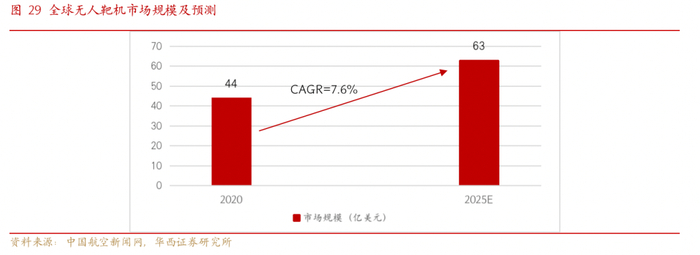 中国靶机市场规模约20亿元,全球靶机行业需求持续提升。中科院工程热物理所专家介绍,靶机属于耗材,空军、二炮和陆军航空等每年训练消耗量都很大,同时像沙特等国外贸出口需求也不小。根据新思界发布的《2019-2023年中国无人靶机市场可行性研究报告》,2018年中国无人靶机行业市场规模为19.5亿元,年增速在15%以上。据asdnews网站2020年6月报道,有关机构发布“全球靶机市场2025年预测”报告,预计2020年全球靶机市场价值为44亿美元,到2025年预计将达到63亿美元,2020年至2025年的复合增长率(CAGR)为7.6%。