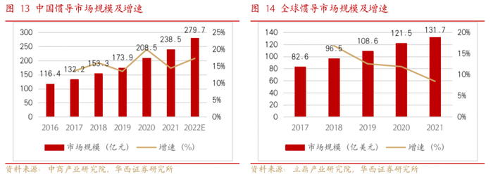 惯导产品应用广泛,市场需求保持较高增速。受益于各类飞行器数量的增加、对导航精度的要求提高以及部件的微小型化和低成本等因素,我国对惯性导航产品需求持续提高。近年来市场规模快速增长,从2016年的116.4亿元增长到了2021年的238.5亿元。根据中商产业研究院预测,2022年我国惯导市场规模预计279.7亿元,同比增长17%。随着全球各国开始规模应用无人系统,同时新型弹道导弹系统、防空导弹系统、空空导弹系统、火炮系统等精确制导武器的需求也不断增长,对惯导系统的需求也日益提高。根据立鼎产业研究院数据显示,全球惯导市场规模从2017年的82.6亿美元增至2021年的131.7亿美元,CAGR达12%。
