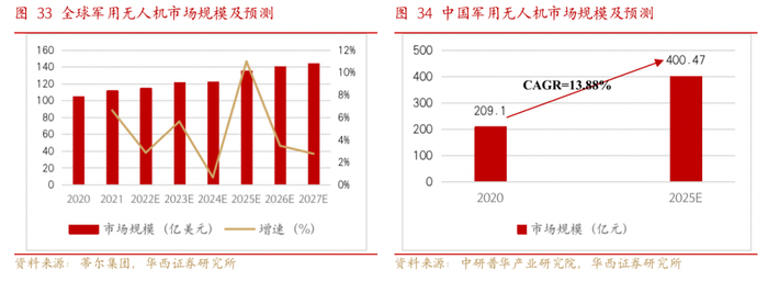 无人机作为信息化战争中的利器,存在广泛市场需求。在信息化战争的发展形势下,无人机等新型装备需求大幅提升,再加上不断爆发的安全问题、领土争端,装备无人机成为了以较低成本增强自身国防实力的有效手段,导致全球军用无人机需求不断扩大。根据蒂尔集团的报告,2020年-2027年全球军用无人机年产值(含采购)逐年增长,到2027年产值预计达到143.99亿美元,市场保持可持续的稳定发展。国内市场来看,根据中研普华产业研究院数据显示,2020年我国军用无人机市场规模达到209.1亿元,预计2025年将达到400.47亿元,CAGR达13.88%。