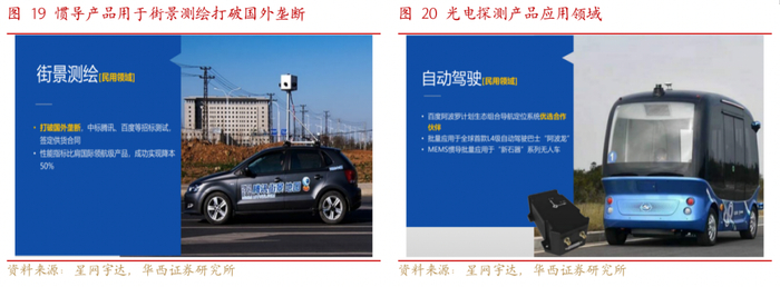 民用领域与百度、美团、新石器等公司合作,部分产品以实现量产。在民用领域,公司无人驾驶主要是为百度、美团、新石器等公司提供惯性基组合导航产品。用于街景测绘的产品打破了国外垄断,产品性能指标也比肩国际领航级产品,成功实现降本50%。无人驾驶方面产品销量持续上升,重点客户实现了批量供货,主要包括美团无人配送车、萝卜快跑无人出租车和百度“阿波龙”无人巴士车等,目前产品已批量应用于“阿波龙”,MEMS惯导也已批量应用于“新石器”系列无人车。