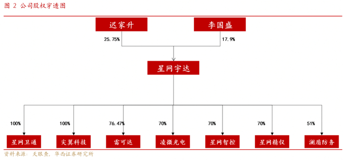 公司股权结构清晰,实控人具备深厚产业背景。公司是国家高新技术企业、北京市军民两用示范企业,实际控制人为迟家升和李国盛,迟家升曾任军事科学院军事运筹分析研究所工程师,李国盛曾于北京武警总队武警3支队1中队、国防科技工业委员会第32试验基地、国防科工委司令部管理局汽车二队服役,均具备军工行业相关背景。旗下包括2家全资子公司星网卫通和尖翼科技以及5家非全资控股公司,此外还有多家参股公司,公司业务主要由母公司和全资子公司开展。