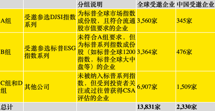 标普全球基于CSA评估方法,从经济、环境和社会的角度出发,每年都会对全球企业的可持续发展表现进行评定。标普全球每年将主动邀请来自61个不同行业的符合资格的公司开展网上问卷填报工作,对企业进行可持续发展评估。值得注意的是,2022年标普全球CSA评估在组别设置方面与去年并不相同。2021年,标普可持续发展指数组别被分为A、B两组,其中A组是DJSI或标普500 ESG指数,B组是除去标普日本500 ESG指数后的标普ESG指数。而2022年,标普全球邀请了超过13,000家企业参与CSA问卷评估,并将受邀企业分为A、B、C、D四组。根据标普全球官网更新的最新邀请名单(截至2022年11月25日),本文概括统计了全球及中国(包括港澳台地区)CSA受邀企业的分组和数量(如下表)。