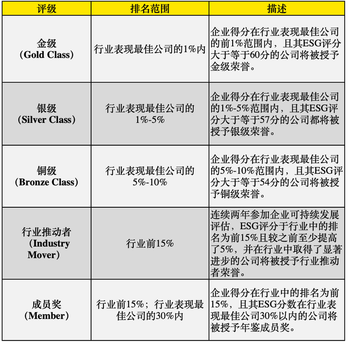 标普全球于2022年2月最新颁布了《2022年可持续发展年鉴》9,对2021年参与CSA评估的超过7,500家企业的可持续发展表现进行了总结归纳,并根据评分与行业分类,对表现优秀的企业由高至低授予金级、银级、铜级、行业推动者及成员奖五类评级(如下表)。