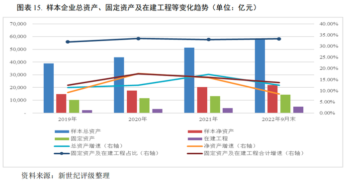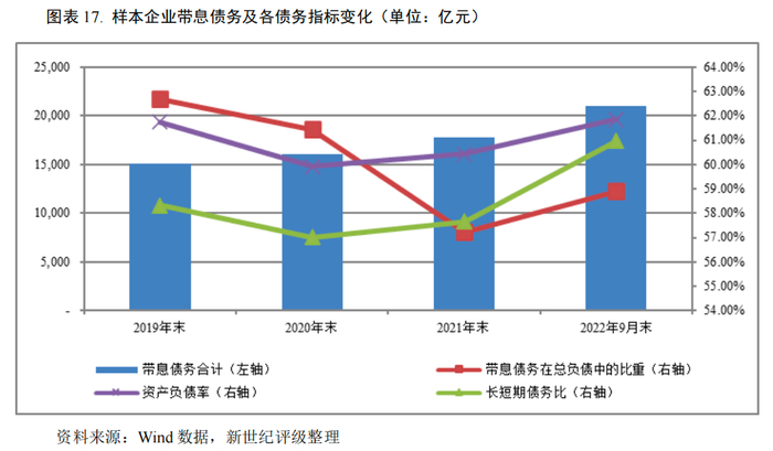 2022年9月末,样本企业总资产和净资产仍保持较快增长,其中固定资产及在建工程规模增速放缓,不同细分板块有所分化;而受原材料价格上涨、库存压力加大影响,样本企业存货和应收账款规模增幅较大,周转速率均放缓,运营效率有所下降。