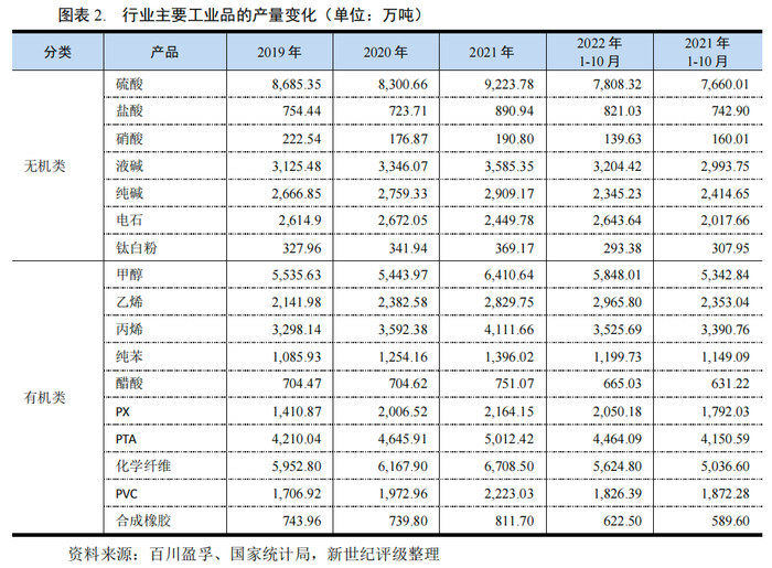 2021年化工行业景气度高企,主要化工产品开工率上升,产量同比大幅增长。2022年,化工行业下游需求低迷,企业开工负荷有所降低,部分产品产量同比有所回落,而部分化工产品由于产能基数的扩大,产量仍保持较快增长。具体来看,2022年1-10月,无机类产品硫酸、盐酸、液碱和电石产量同比分别增长1.94%、10.52%、7.04%和31.03%;硝酸、纯碱和钛白粉产量同比分别减少12.74%、2.87%和4.73%。同期,除PVC产量同比小幅下降2.45%外,主要有机类产品产量均实现同比增长,其中增幅较大的有甲醇(9.36%)、乙烯(26.04%)、PX(14.41%)、PTA(7.55%)、化学纤维(11.68%)。