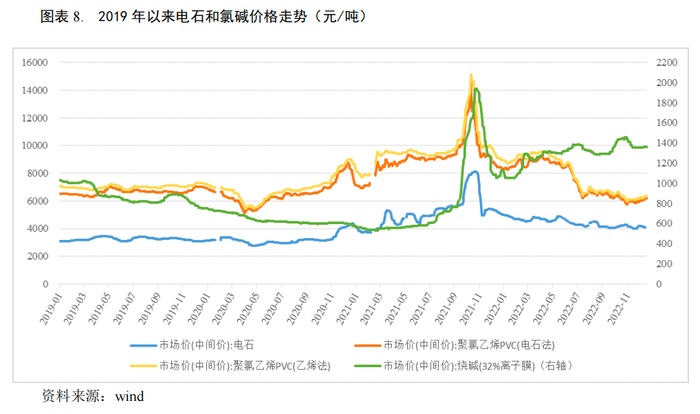氯碱产品价格变动方面,2022年年初PVC价格在原油、煤炭带动下小幅上涨,但随后受国内疫情影响,下游需求萎缩,供需失衡导致价格快速回落,截至2022年11月末PVC(电石法)均价为5,940元/吨,较上年末下降28.62%。PVC主要原料电石受下游需求疲软影响价格整体波动下行,截至2022年11月末价格较上年末下降17.10%。烧碱方面,2022年下游氧化铝企业新增产能陆续投产释放,带动局部地区烧碱需求量增加,同时海外烧碱需求增加拉动出口,对烧碱价格形成利好支撑,截至2022年11月末烧碱价格较上年末上涨20.25%至1,354元/吨。