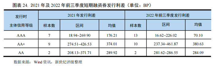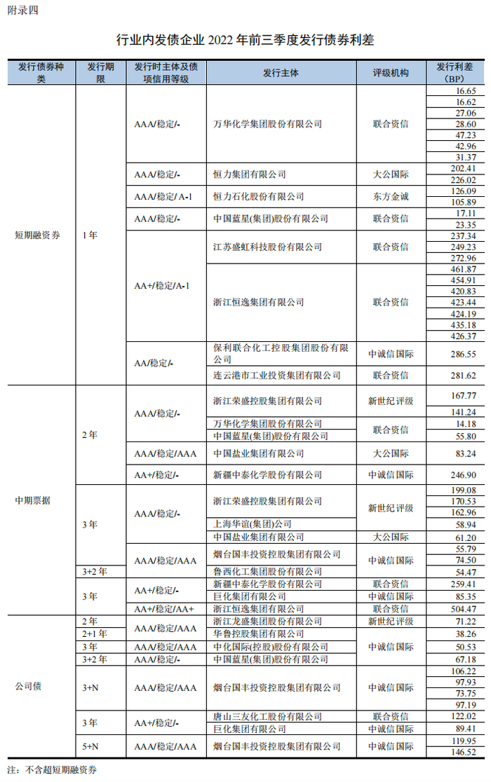 2021年行业内企业共发行18支一般短期融资券,主体信用等级为AAA级、AA+级和AA级的债券发行利差均值分别为176.21BP、374.01BP和284.09BP;2022年前三季度行业内企业共发行25支一般短期融资券,主体信用等级AAA级、AA+级和AA级的债券发行利差均值分别为70.10BP、380.63BP和284.09BP,其中AAA级民营企业恒力集团及其上市子公司恒力石化的短券发行利差显著高于国有企业万华化学和蓝星集团;主体信用等级AA+级的债券发行利差与主体信用等级AA级的债券发行利差均值产生倒挂,主要系AA+级的浙江恒逸集团有限公司发行的债券利差较大,其发行的7支短期融资券平均利差约为435BP。
