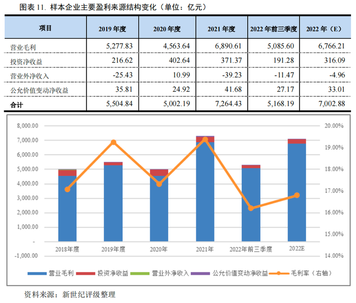 2022年前三季度,样本企业营业收入和营业成本同比分别增长18.36%和23.46%,样本企业营业毛利为4,961.21亿元,同比减少2.45%;毛利率同比下降3.46个百分点至16.21%。从盈利构成看,营业毛利仍是最重要的盈利来源,近两年来占总盈利的比重在95%左右;非经常性损益方面,投资净收益同比减少39.49%,公允价值变动净收益同比减少17.68%,营业外净支出同比进一步增加。总体而言,2022年前三季度样本企业的盈利能力减弱。